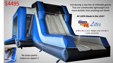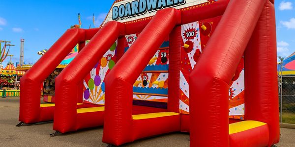 At Games to Go Sales, we are committed to providing high-quality new inflatable products regularly. Introducing "Boardwalk". A 3 - station carnival game. 19'L x 10' D x 10' H. Weight is only 65 lbs.